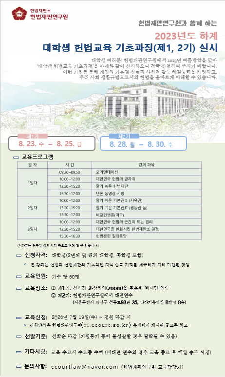 2023년도 하계 대학생 헌법교육 기초과정 1, 2기 지원서 접수는 마감되었습니다.