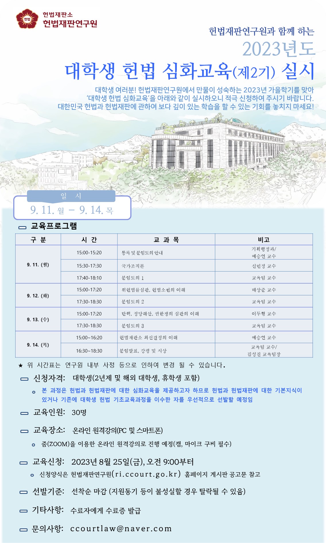 우리 연구원에서는 2023년 가을학기를 맞아 대학생 헌법교육 심화과정(제2기)에 참여하실 대학생들을 모집합니다.