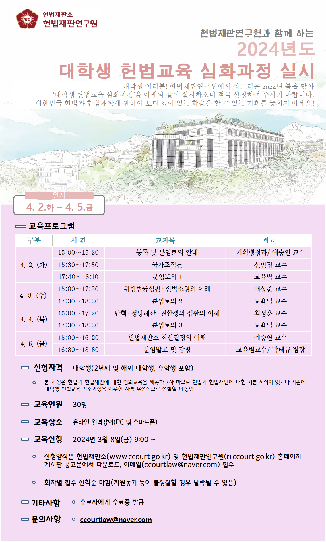 우리 연구원에서는 2024년 봄학기를 맞아 대학생 헌법교육 심화과정(제1기)에 참여하실 대학생들을 모집합니다.