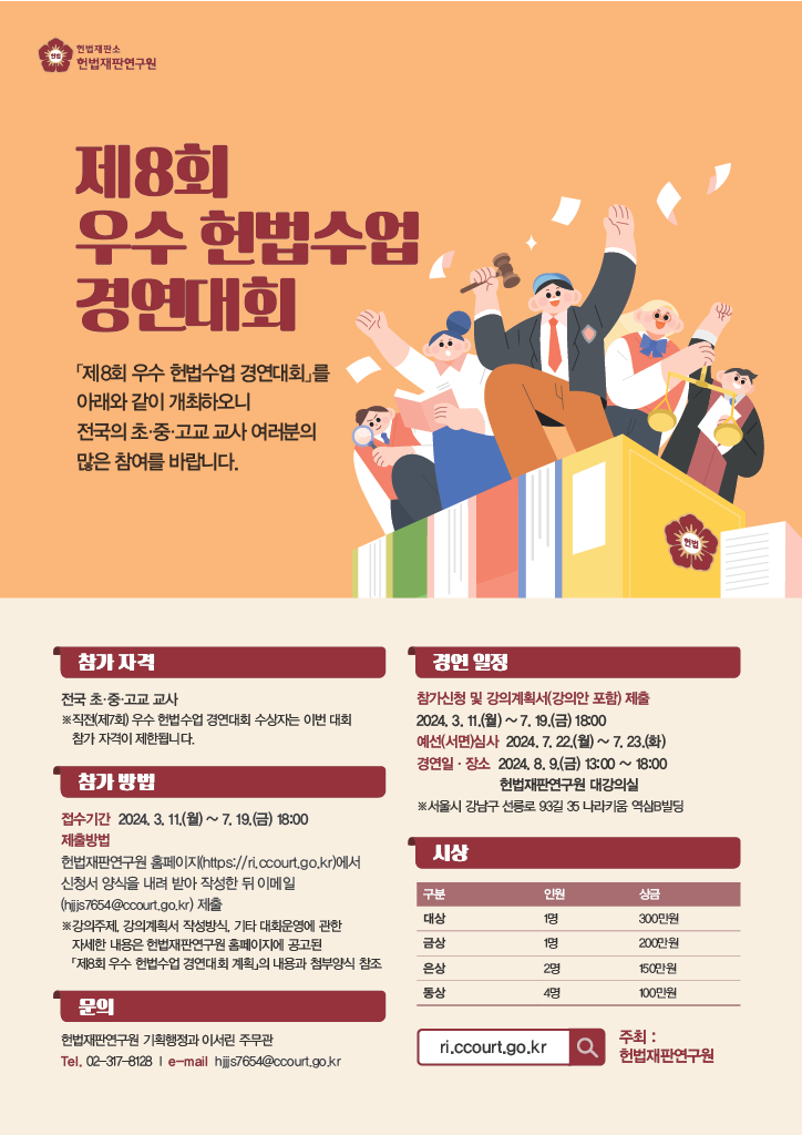 「제8회 우수 헌법수업 경연대회」를 아래와 같이 개최하오니 전국의 초·중·고교 교사 여러분의 많은 참여를 바랍니다.